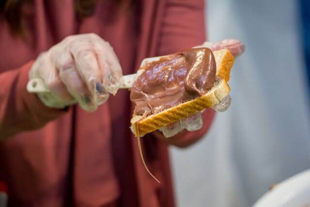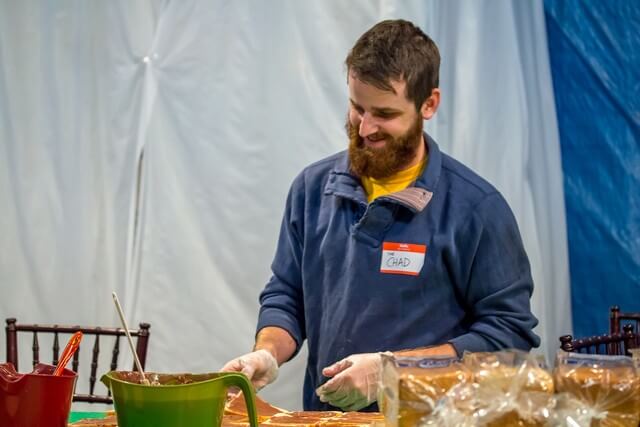 I arrived at Landmark Restorations’ warehouse space-turned-PB&J assembly line around 9:30 am in the morning with co-workers Jenn and Chad. We were met with Starbucks coffee, juice, and sweet rolls for a quick breakfast before getting down to business. It was obvious that the folks at Landmark Restorations are no amateurs; the warehouse space was optimized for assembly-line style sandwich-making with lined tables, spatulas for spreading, and an inconceivable amount of bread loaves. We grabbed our plastic gloves and joined the fun. Between Jenn, Chad, Jase and me, we probably made at least 100 loaves worth of sandwiches.