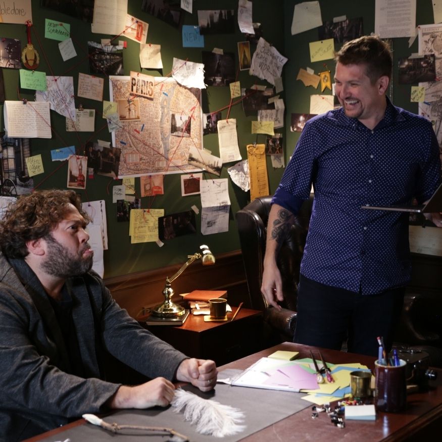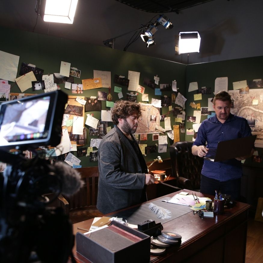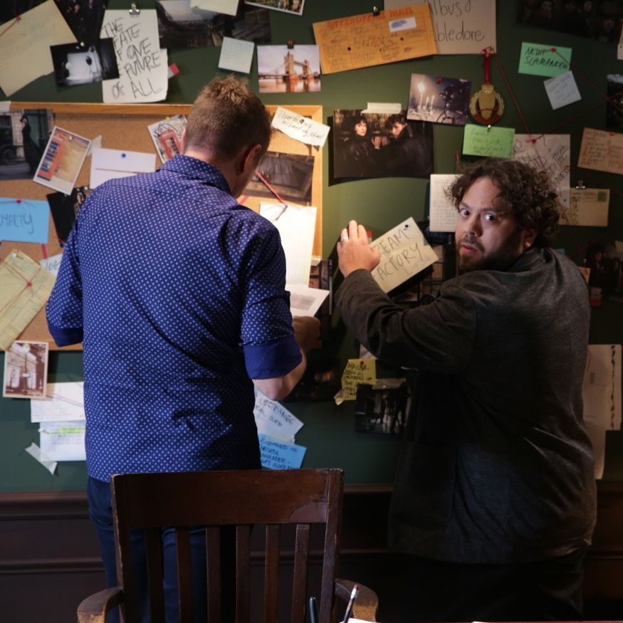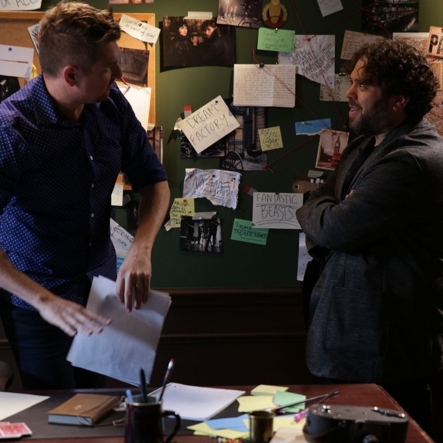 What made the project especially fun was the creative world-building. We were not just dropping talent onto a blank cyc wall and asking for clean reads. The visual concept called for Dan to be surrounded by research, maps, storyboards, props, pinned notes, string connections, desk clutter, and other details that made the set feel like a real working investigation room inside the Wizarding World. The set-build deck laid that out clearly: large pinboards, dark walls, layered materials, wooden furniture, and enough merchandise and prop dressing to make the whole thing feel lived in rather than staged.