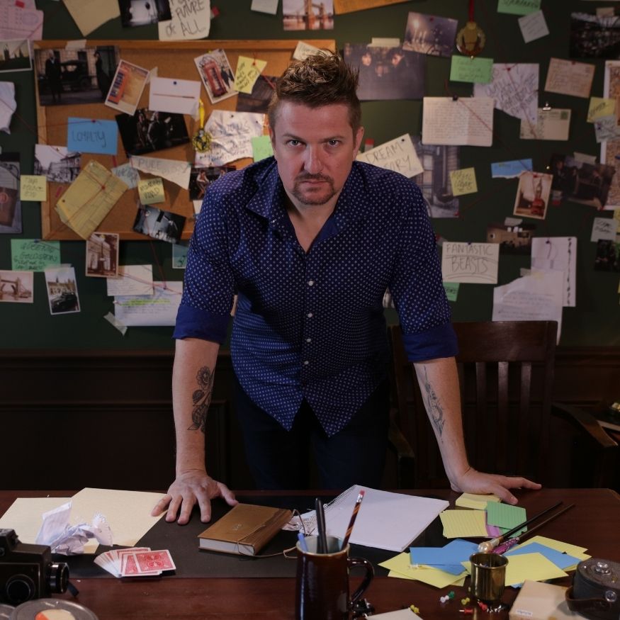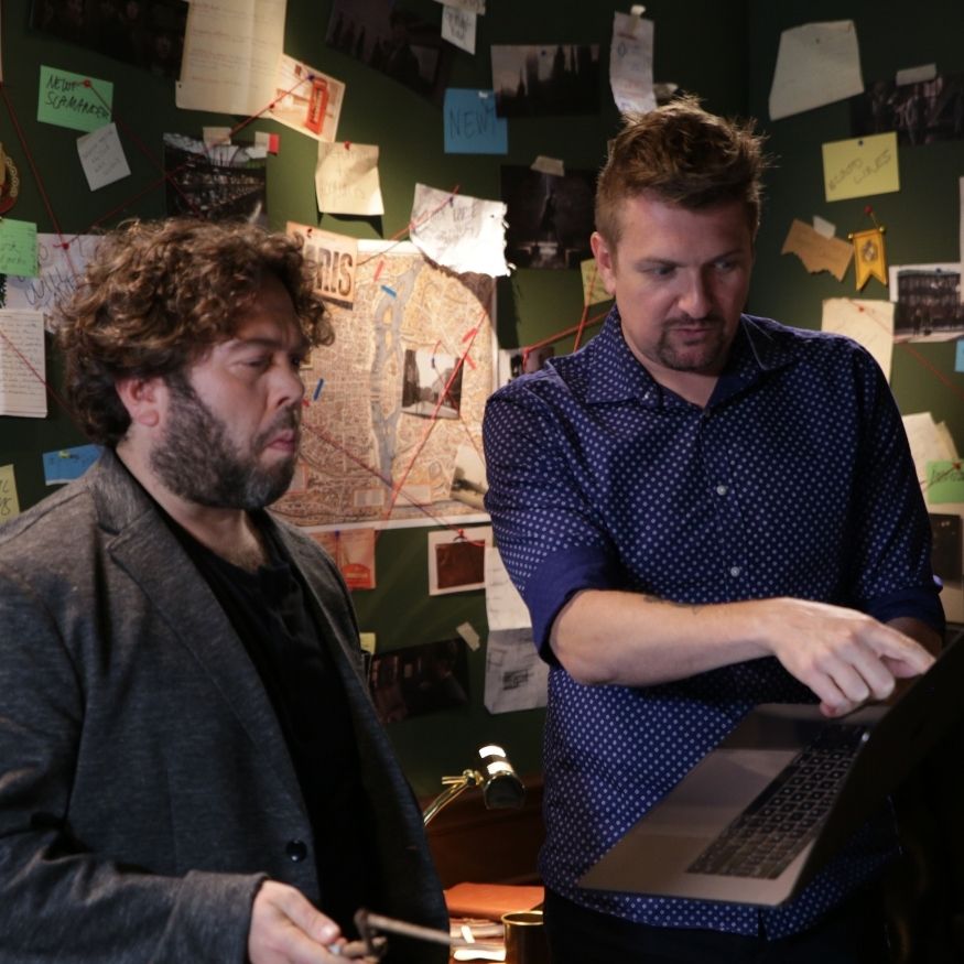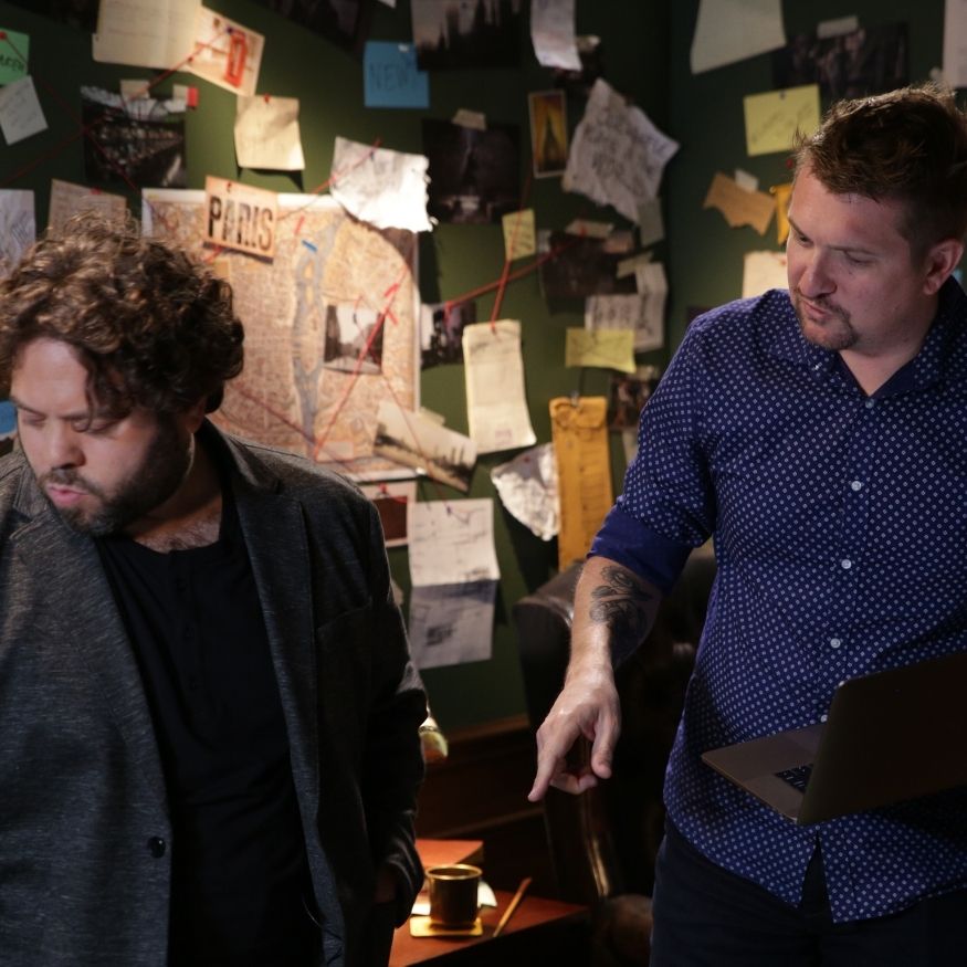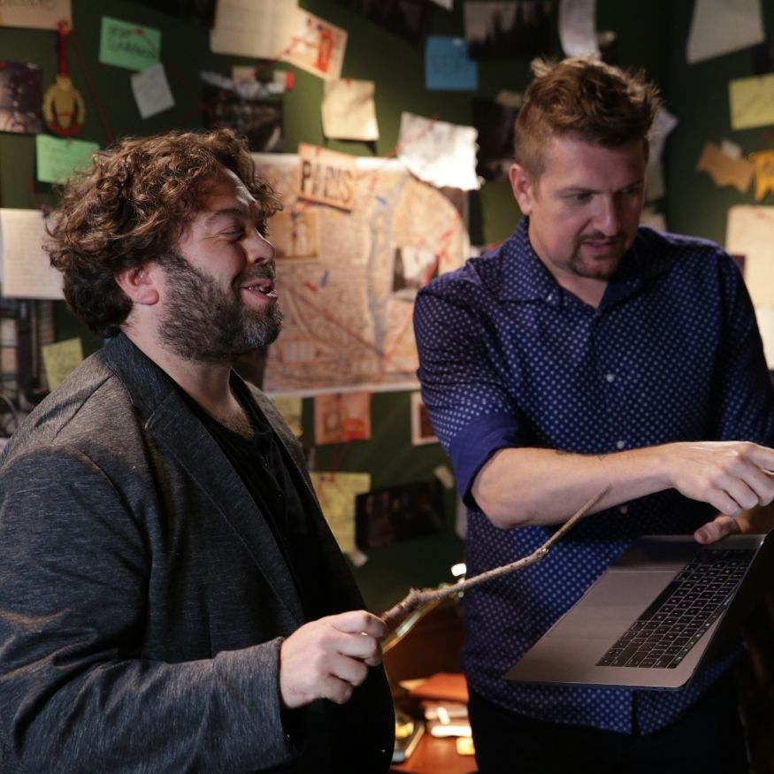 What made the project especially fun was the creative world-building. We were not just dropping talent onto a blank cyc wall and asking for clean reads. The visual concept called for Dan to be surrounded by research, maps, storyboards, props, pinned notes, string connections, desk clutter, and other details that made the set feel like a real working investigation room inside the Wizarding World. The set-build deck laid that out clearly: large pinboards, dark walls, layered materials, wooden furniture, and enough merchandise and prop dressing to make the whole thing feel lived in rather than staged.